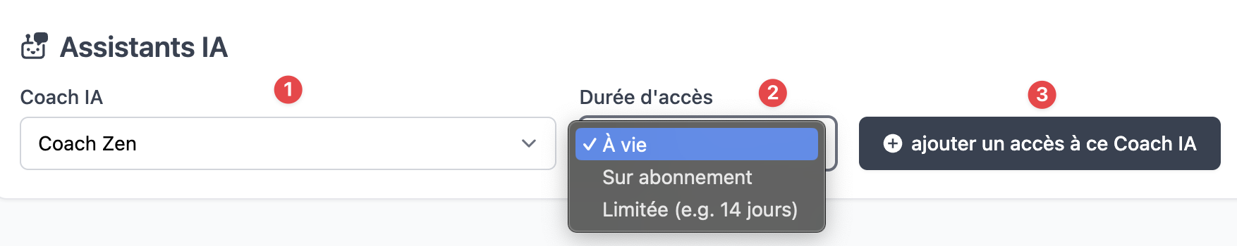 - Choisissez la durée d'accès durant laquelle vos membres auront accès à ce Coach IA (à vie, sur abonnement ou limitée pendant X jours)