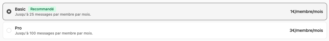 1€/mois pour chaque membre y ayant accès (jusqu'à 25 messages par membre par mois)