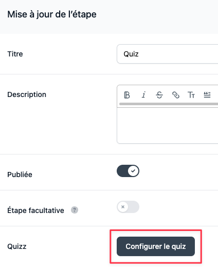 Dans la leçon concernée, cliquez sur le crayon au niveau de l'étape Quiz.