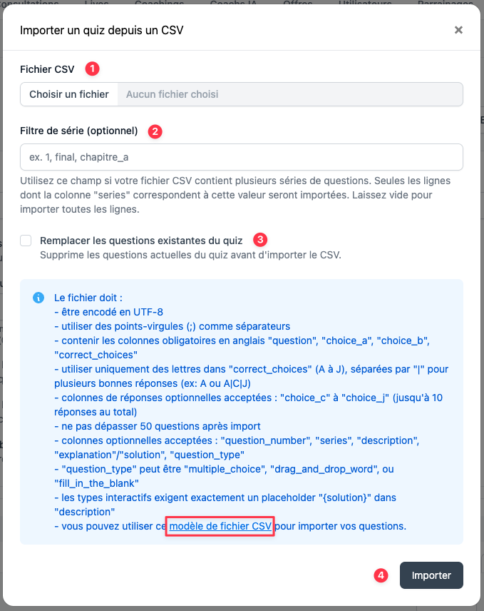 - Un modèle de fichier CSV est également disponible