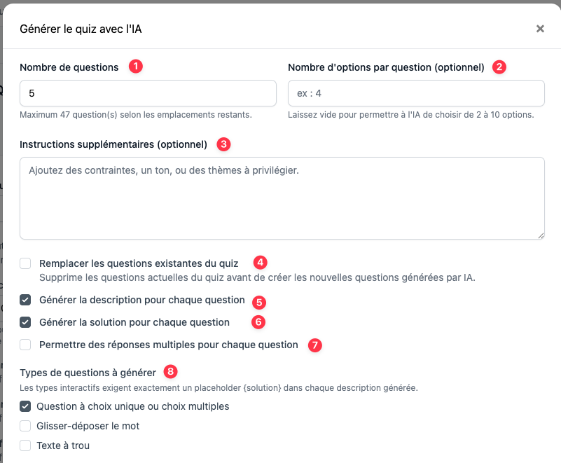 - Cochez cette case pour remplacer les questions existantes de votre Quiz