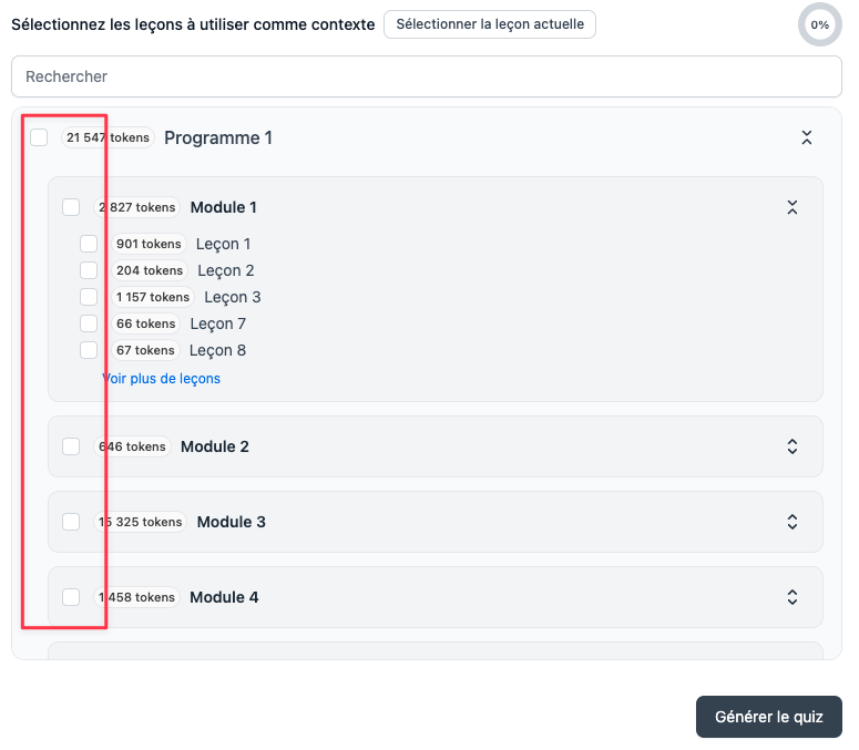 Sélectionnez les leçons de votre programme à utiliser comme contexte pour générer votre Quiz.