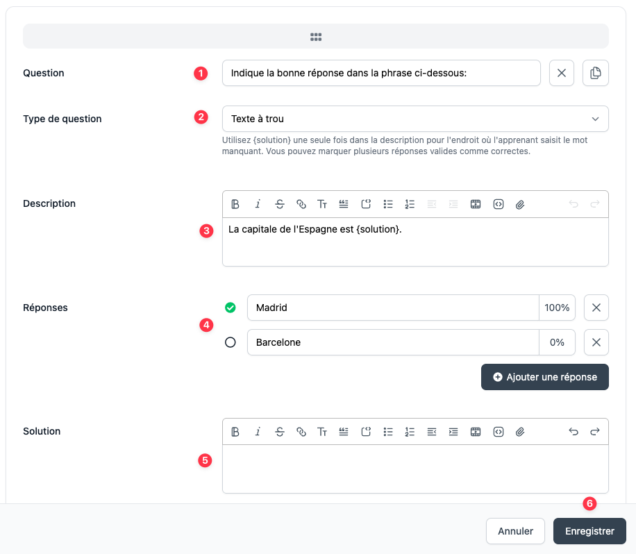 - Indiquez la phrase à compléter: Utilisez {solution} une seule fois dans la description pour indiquer l'endroit où l'apprenant doit indiquer le bon mot